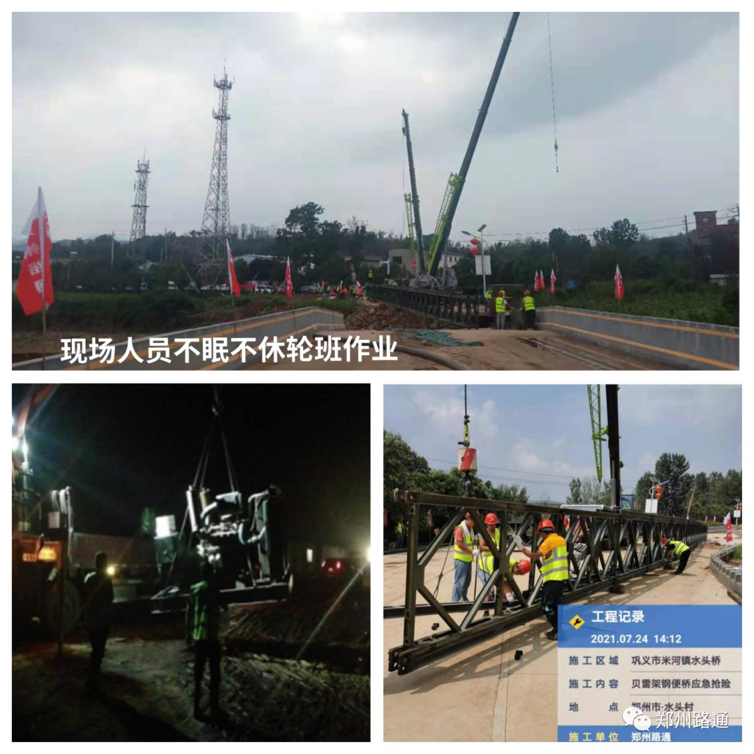 7月22日晚,路通公司緊急調(diào)派40余人及10余臺(tái)施工機(jī)械進(jìn)駐鞏義市米河鎮(zhèn)展開(kāi)救援,班子成員親臨現(xiàn)場(chǎng)研究搶險(xiǎn)方案,施工人員不眠不休、輪班作業(yè)。為加快施工進(jìn)度,24日凌晨3點(diǎn),所有現(xiàn)場(chǎng)人員全體參與鋼架橋配件的卸車工作,當(dāng)前米河鎮(zhèn)水頭村水頭橋鋼便橋已拼裝完畢,計(jì)劃連夜完成安裝任務(wù),確保25日早橋上順利通車。