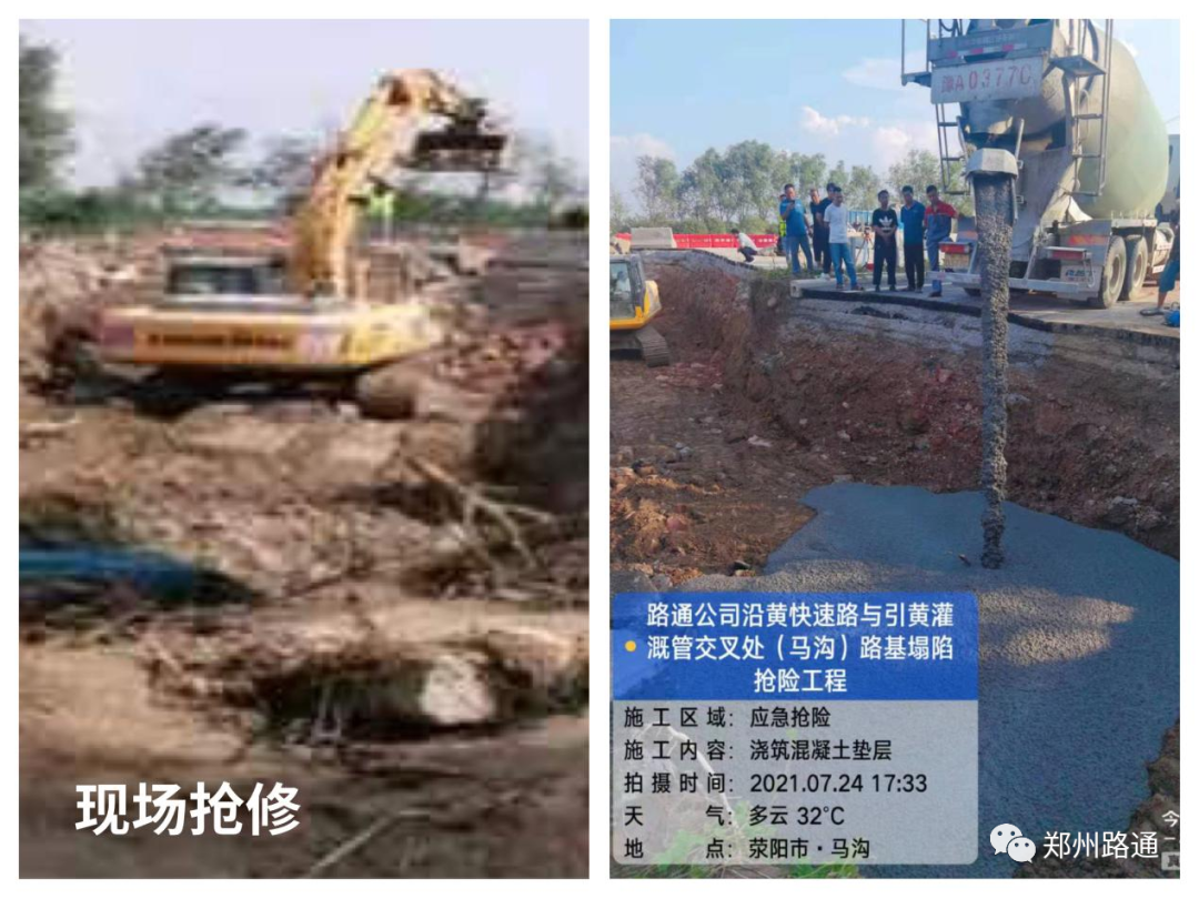 7月23日中午,路通公司接到指令,地處滎陽(yáng)的S312沿黃快速路與鄭焦高速互通立交西側(cè)匝道及沿黃快速路與其相連主體出現(xiàn)路基空洞,東西雙向完全斷行,要求搶修。路通公司下午即刻派駐18人,出動(dòng)六臺(tái)施工機(jī)械進(jìn)駐現(xiàn)場(chǎng)進(jìn)行搶修。截止7月24日下午,北半幅溝槽開(kāi)挖完成,正在進(jìn)行管道基礎(chǔ)施工;南半幅臨時(shí)回填完成,已開(kāi)放半幅雙向分流通行。